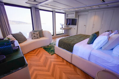 The elegantly designed cabins aboard KAYRA welcome up to eight guests in sophisticated comfort. The master suite on the bridge deck showcases sweeping panoramic views and a spacious en-suite bathroom with a bathtub, offering a true sanctuary for relaxation. On the main deck, the VIP cabin is enhanced by a private balcony, allowing guests to feel seamlessly connected to the ocean. Two further guest cabins blend refined aesthetics with tranquil comfort, ensuring each guest enjoys a restful and rejuvenating escape immersed in Indonesia’s breathtaking natural beauty.