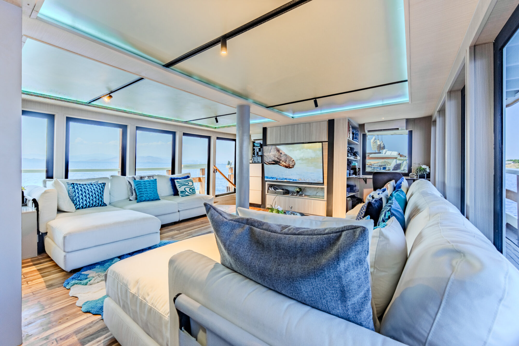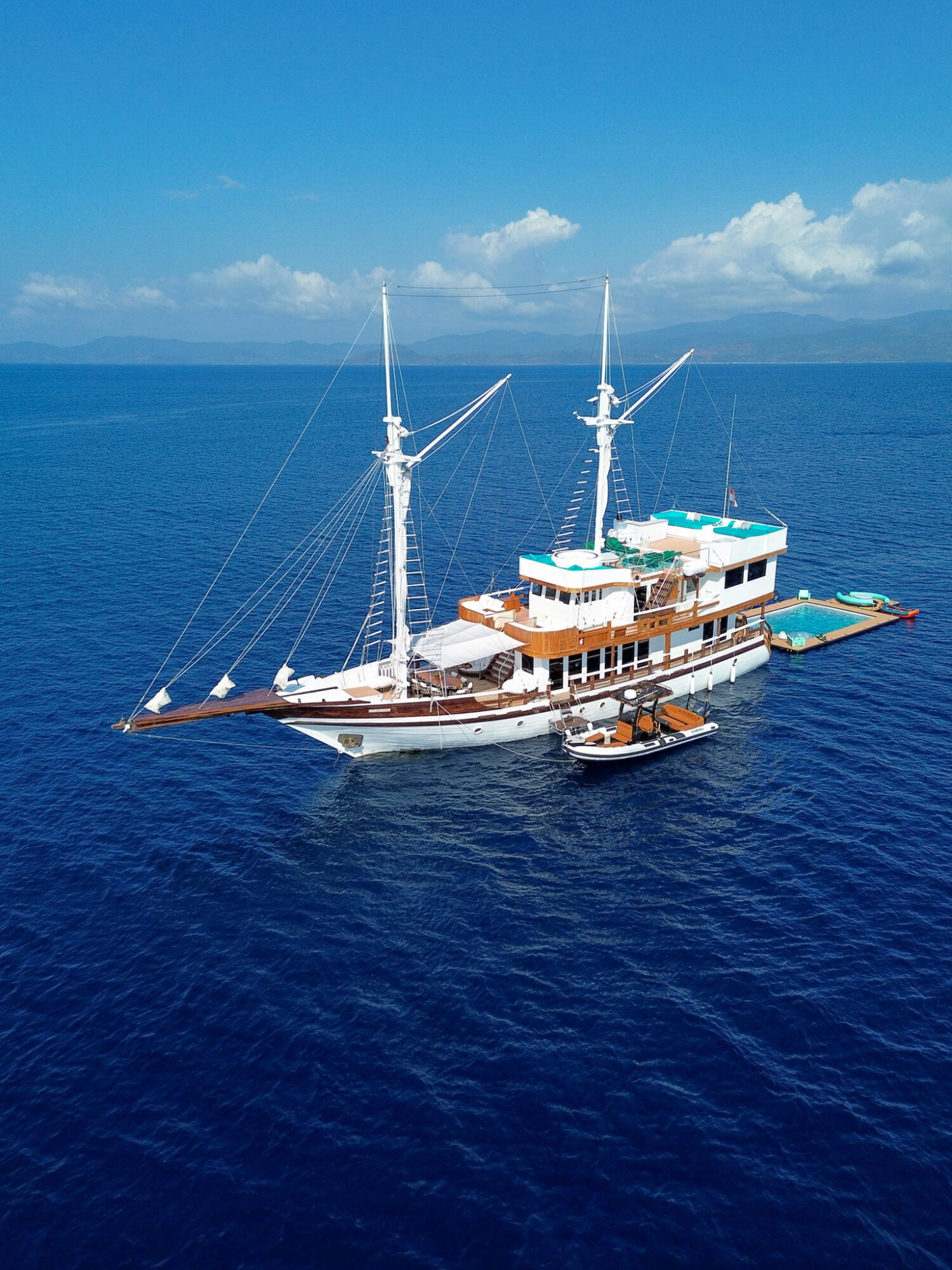 On the upper deck, a large Bimini creates a shaded haven where guests can relax, take in the breathtaking scenery, and enjoy the serene atmosphere of Indonesia’s islands.