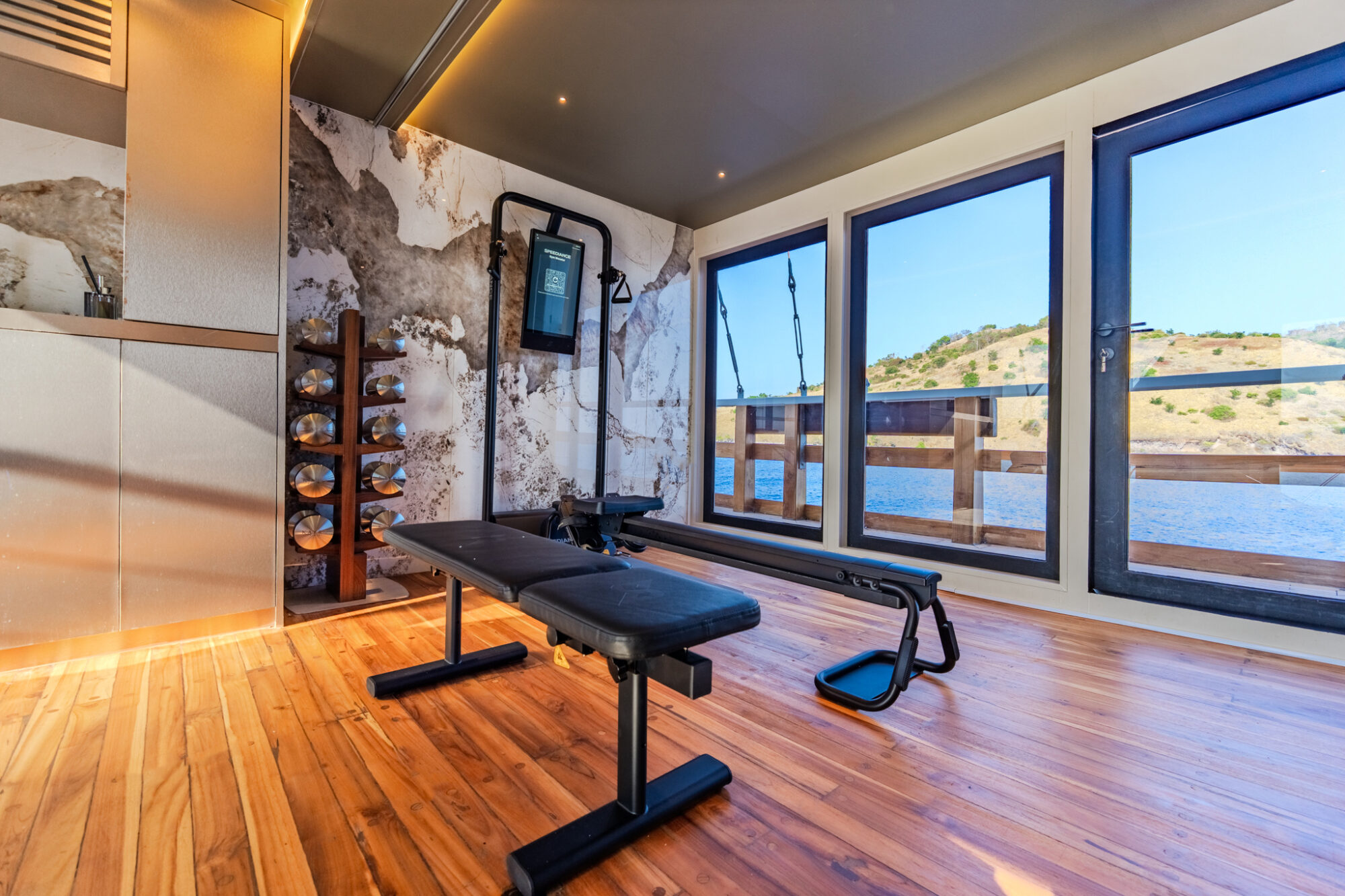 Use of equipment on board: (Sauna, gym, exercise bike, weights, yoga mats, board games, movie library)